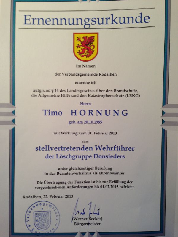 ___________________________________________________________________________________________________________ Wehrführung wieder komplett – Hornung neuer Stellvertreter Die Wehrführung der Löscheinheit Donsieders ist wieder komplett. Auf dem diesjährigen Kameradschaftsabend am 22. Februar in Münchweiler vollzog Werner Becker, Bürgermeister der VG Rodalben, die Ernennung des Hauptlöschmeisters Timo Hornung zum stellvertretenden Wehrführer und vervollständigte so die Wehrführung der Löscheinheit wieder. Hornung wurde am 16. Januar mehrheitlich durch die Kameradschaft gemäß Bestimmungen des LBKG gewählt. Der 27-jährige, hauptberufliche Finanzbeamte, freute sich sichtlich über die Ernennung. Er gehört seit über 10 Jahren der Löscheinheit Donsieders an und ist seit nunmehr 17 Jahre bei den Floriansjüngern aktiv. In Zukunft wird Hornung in Donsieders für den Verwaltungsbereich (Materialbeschaffung, Vergabe von Ausbildungsplätzen, Meldungen an die Verwaltung etc.) zuständig sein.