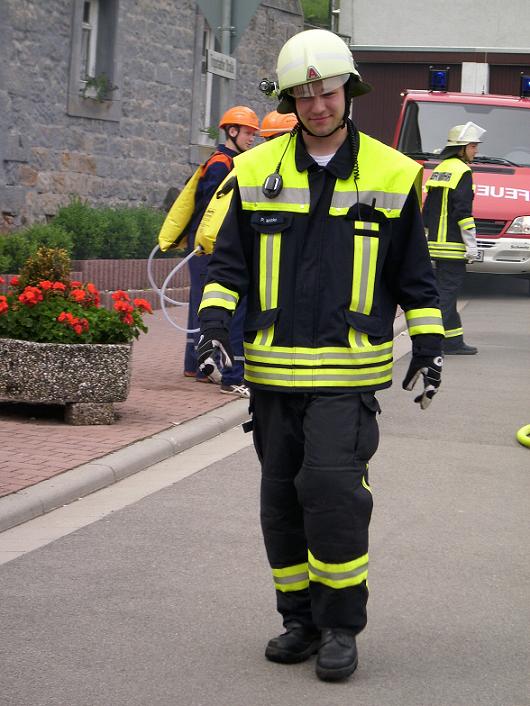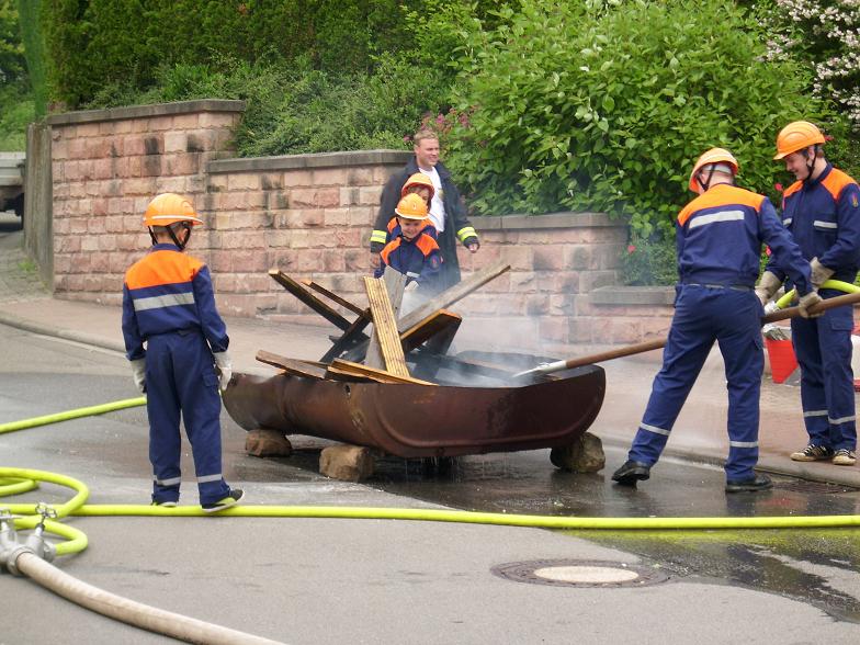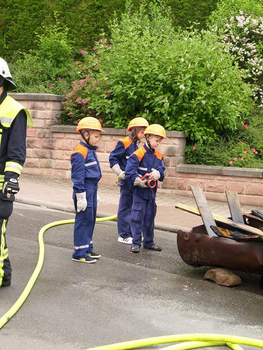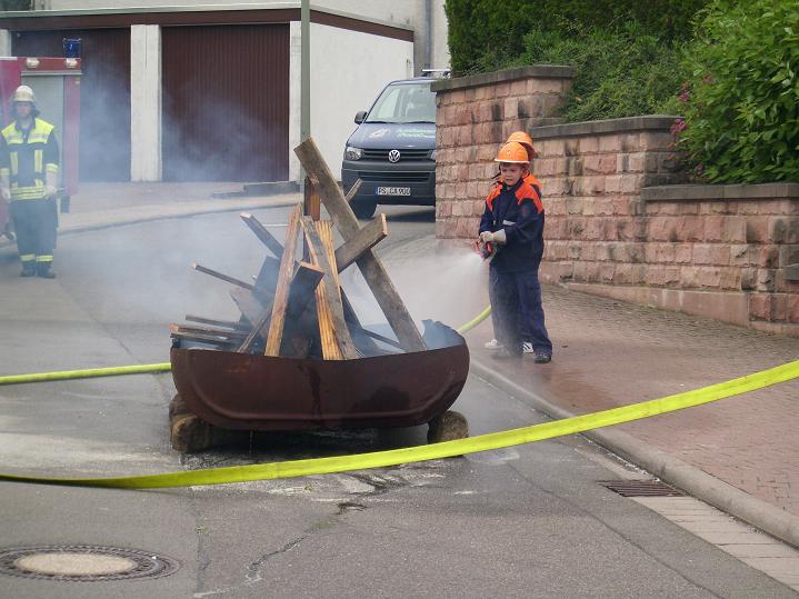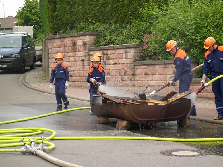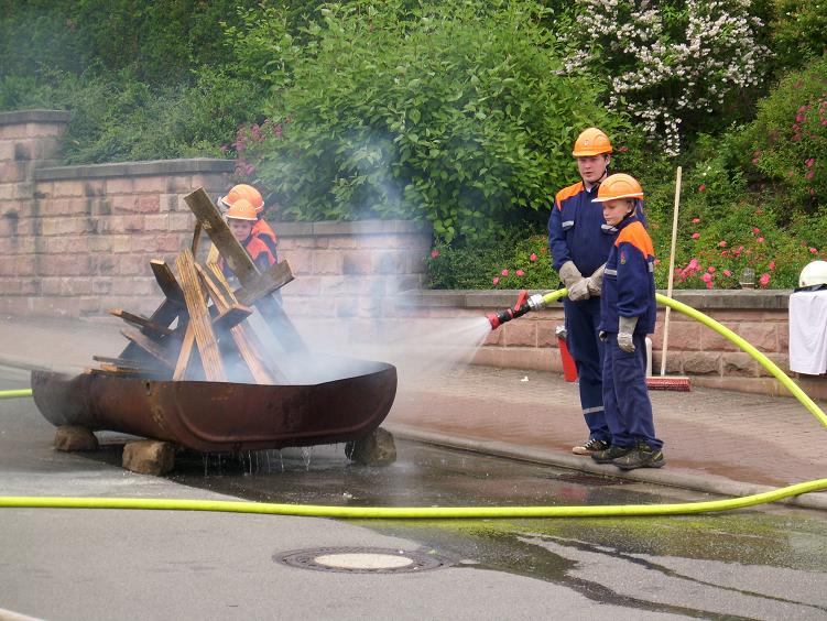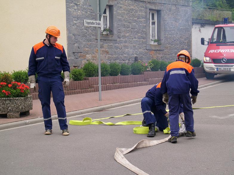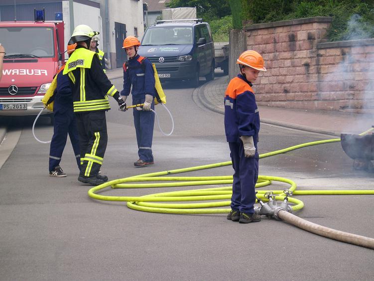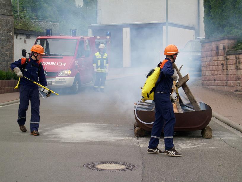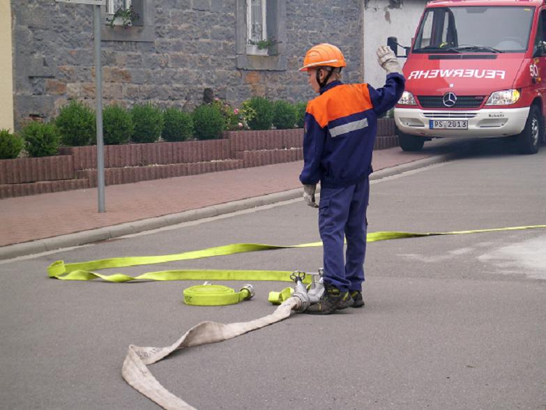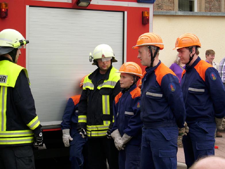 Kurze Zeit danach traf auch das TSF-W an der Einsatzstelle ein. Der Fahrer Florian Ferdinand (stellvertretender Jugendfeuerwehrwart) spielte dabei Gruppenführer. Er ließ sich über die Lage des Einsatzes vom Einsatzleiter Patrick Wetzke informieren. Danach ging er zu seiner Mannschaft und teilte ihnen seinen Befehl zur Brandbekämpfung mit. Die Wasserversorgung stellten sie über das TSF-W, das mit 800 Litern Wasser bestückt ist, her. Den Wassertrupp bildeten die zwei Jugendfeuerwehrleute Oliver Seibert und Christian Ritter. Ihre Aufgabe war es eine Wasserversorgung vom TSF-W bis zum Brandherd aufzubauen. Am Verteiler befand sich der Jugendfeuerwehrmann Johannes Lahner. Er gab den Befehl zum Maschinisten „Wasser marsch“. Als Angriffstrupp und somit an erster Stelle agierten die zwei Feuerwehrleute Hannah Wenger und Kevin Burkhard. Den Melder und somit die Unterstützung des Einsatzleiters übernahm unser Feuerwehrmann Tim Gerlach. Nach einigen Minuten hatte unsere Jugendfeuerwehr das Feuer unter Kontrolle. Einsatzleiter Patrick Wetzke war über den Verlauf der Übung sehr zufrieden. Das Publikum wurde durch Markus Braun (Jugendfeuerwehrwart) über einen Lautsprecher informiert.