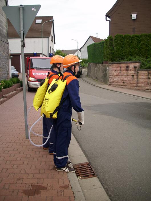 An unserem Feuerwehrfest absolvierte unsere Jugendfeuerwehr Leimen eine Waldbrandübung. Als erstes wurde unser VRW alarmiert, wonach eine Besatzung von eins zu zwei ausrückte. Der Fahrer war Einsatzleiter Patrick Wetzke (stellvertretender Jugendfeuerwehrwart), den Angriffstrupp bildeten die zwei Jugendfeuerwehrleute Marc Bachmann und Max Helfrich. Diese beiden gingen nach ihrem Befehl, den sie durch den Einsatzleiter bekamen, mit den neuen Tankrucksäcken zur Brandbekämpfung vor.