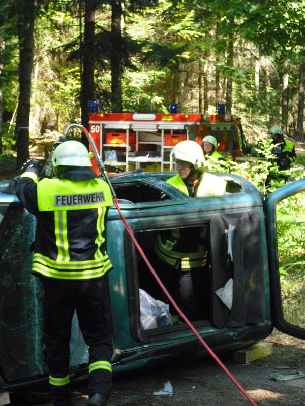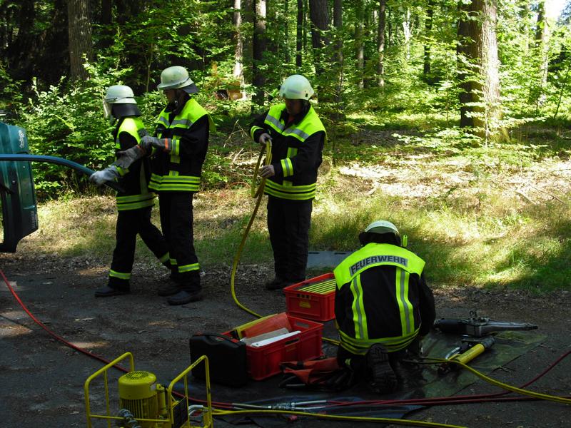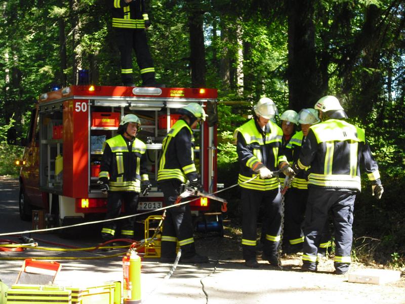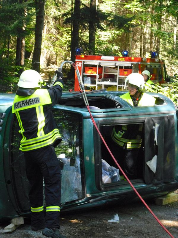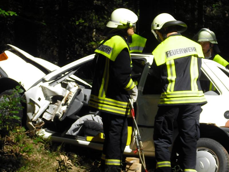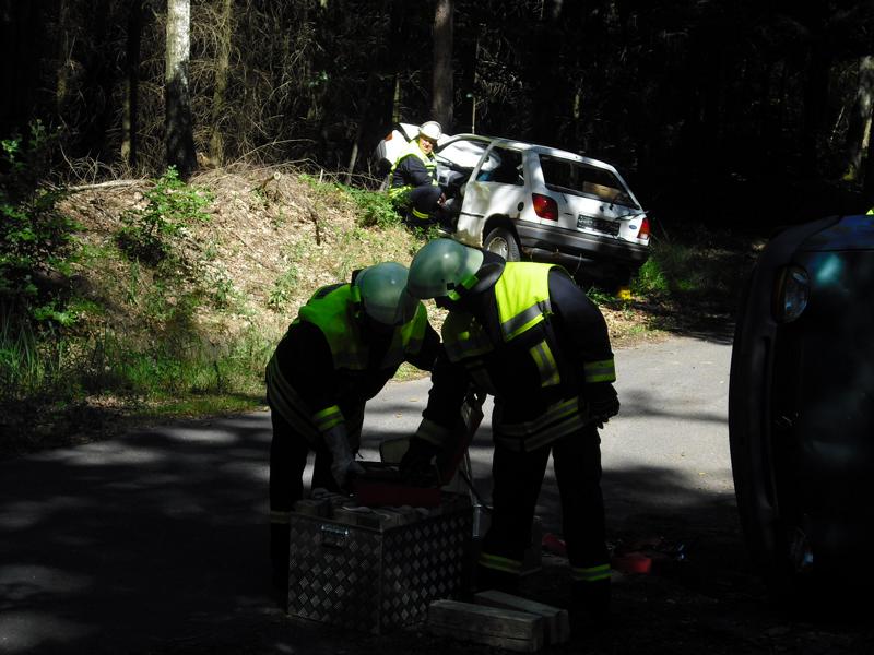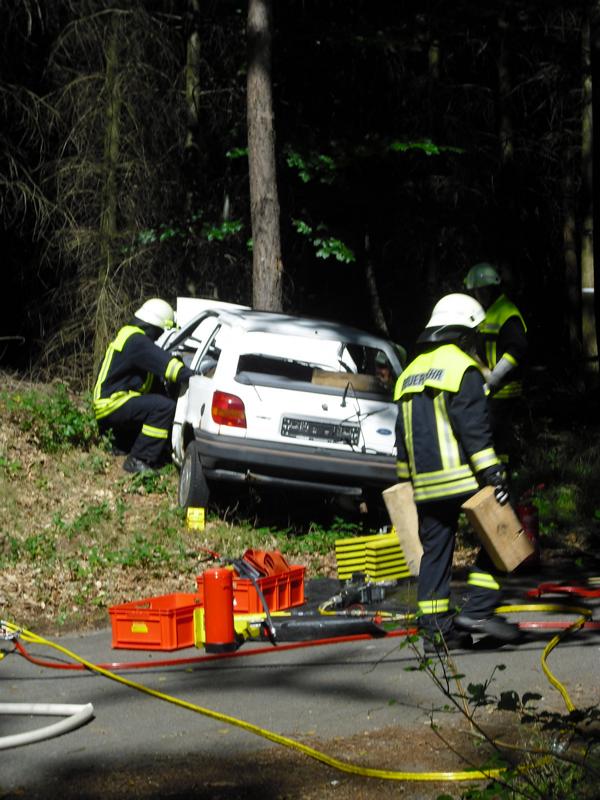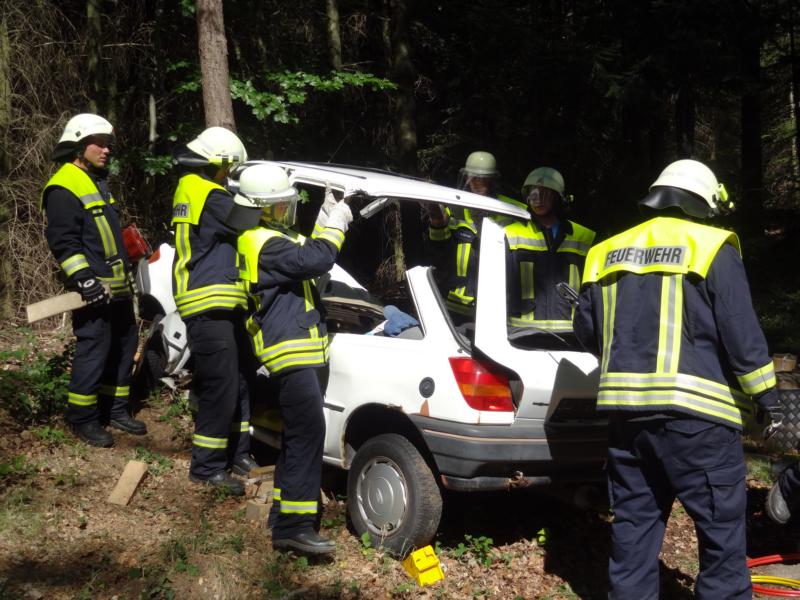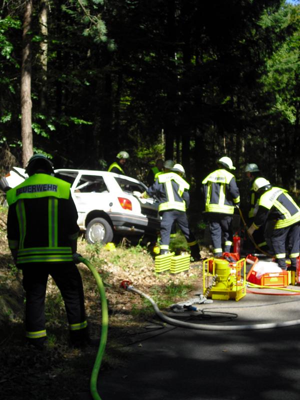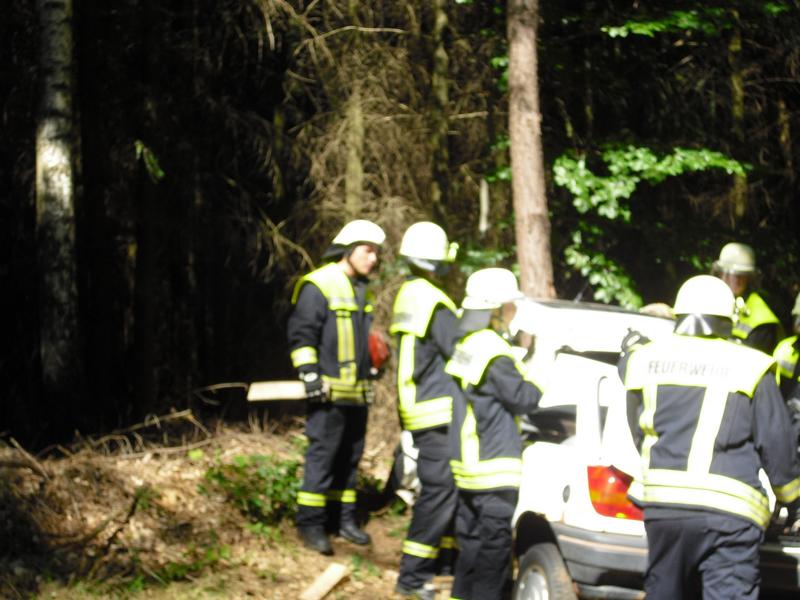 | Später kamen weitere drei Feuerwehrleute an die Unfallstelle nach. Die Fahrt ging Richtung Johanniskreuz an den Wertholzlagerplatz im ehemaligen Militärlager. Wir staunten nicht schlecht, als wir den nachgestellten Unfall sahen. Ein Auto lag auf der Seite und es befand sich eine nicht ansprechbare Person darin. Das zweite Auto fuhr frontal gegen einen Baum. Darin befand sich eine Person, die zwar ansprechbar war, aber das Fahrzeug nicht verlassen konnte, da sie eingeklemmt war. Zuerst wurde die Unfallstelle großräumig mit einer Vollsperrung abgesichert. Danach fingen wir an, am ersten Auto eine Crashrettung vorzunehmen. Dies bedeutet eine schnelle Rettung der verletzten Person aus ihrem Fahrzeug. Der Einsatzleiter Ulrich Wenger (Wehrführer) lies das Auto mit zwei Steckteilleitern gegen Umkippen sichern und gab dann den Befehl, das Dach des Fahrzeuges zu entfernen. Dies ging alles sehr rasch und so konnte man schon nach wenigen Minuten an die verletzte Person herankommen. Mit einem Rettungsbrett wurde der Verletzte letztendlich befreit und an der Unfallstelle erstversorgt. Somit hatten wir die erste Peron gerettet und gingen zum zweiten Auto vor. Wir erkundeten auch hier zunächst die Lage und stellten fest, dass sich das Auto sehr nahe an einem Baum befand. Ein Arbeiten mit dem hydraulischen Rettungszylinder wäre in dieser Situation nicht möglich gewesen. Daher suchten wir uns ein Anschlagmittel, in unserem Fall ein Buchenbaum, und zogen das Fahrzeug mit Hilfe eines Drahtseils und dem Spreizer vom Baum weg. Als wir dies gemeistert hatten, begannen wir auch hier mit der Personenrettung. Zuerst sicherten wir wiederum das Auto und begannen dann mit dem hydraulischen Rettungssatz (Schere, Spreizer und Rettungszylinder), die verletzte Person zu retten. Auch in diesem Fall nahmen wir das Dach vom Fahrzeug ab, um besser an die Person zu kommen. Nach kurzer Zeit konnten wir auch die zweite Person befreien und sie, wie auch die erste Person, an den Rettungsdienst übergeben. Diese Einsatzübung war für die Freiwillige Feuerwehr ein voller Erfolg und wir konnten uns mal wieder beweisen, dass wir für den Ernstfall gerüstet sind. Ein ganz besonderer Dank geht an Benjamin Helfrich und Christian Lahner, die diese Einsatzübung verwirklicht haben. Für solch eine Übung braucht man mehrere Geräte wie z. B. einen Radlader und Anhänger, um die Autos so zu justieren. Ein großes Dankeschön geht auch an die Firma Klaus Stümper (Schrott- und Autoverwertung) aus Pirmasens für die Bereitstellung der Fahrzeuge. Wenn wir solche Möglichkeiten nicht hätten, könnten wir uns für den Ernstfall nicht so gut vorbereiten. Wir haben auch zusätzlich die Sonderübung per Videokamera aufgenommen, um sie in den nächsten Übungen zu analysieren. Auch hier ein Dankeschön an die Kamerafrau Michaela Lahner und die Fotografin Nathalie Ernst. |