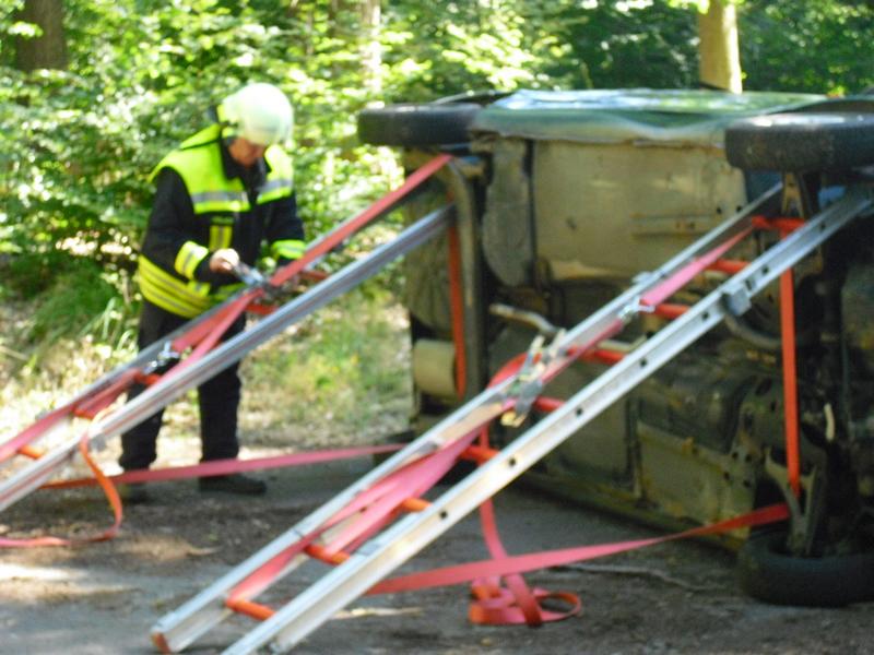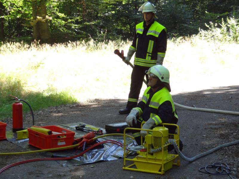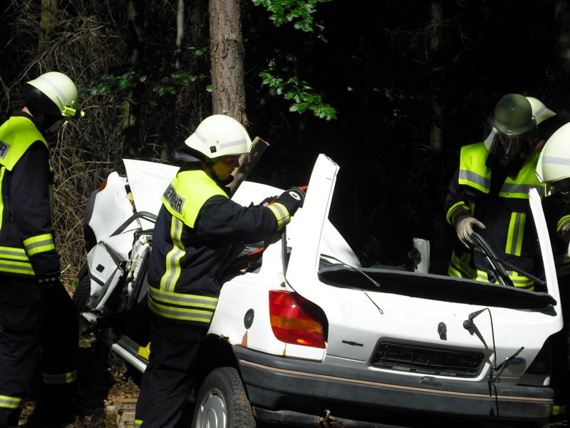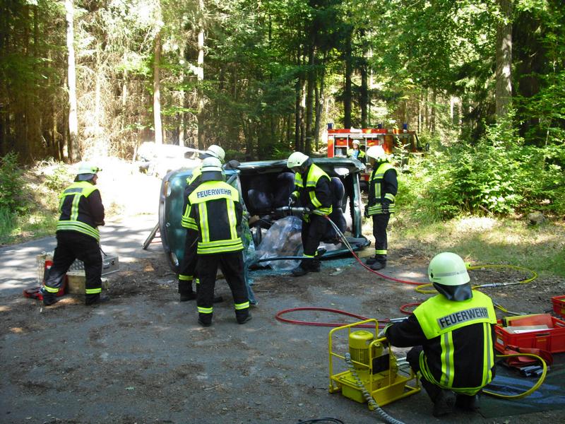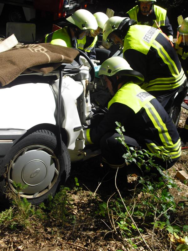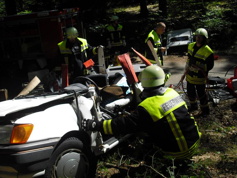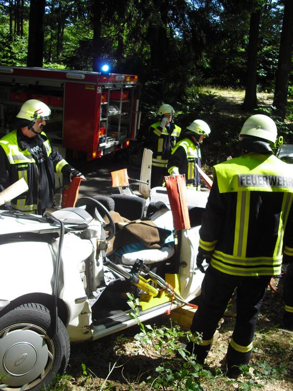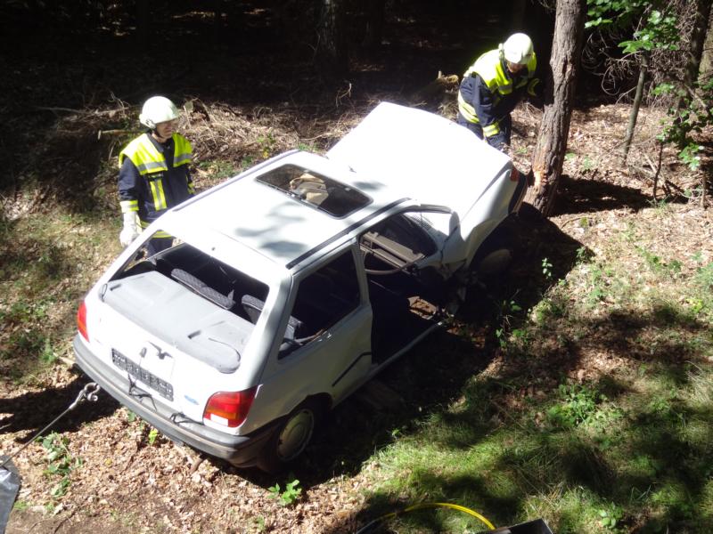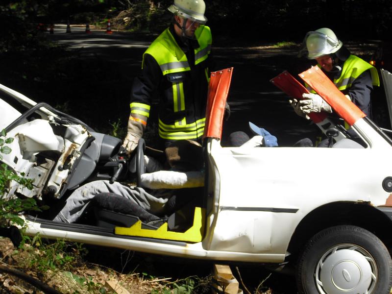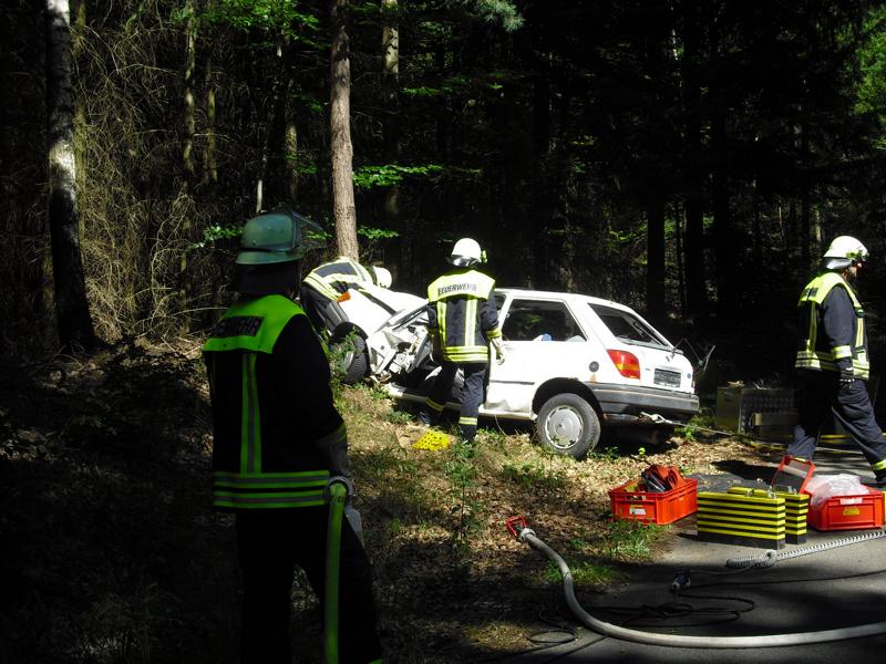| Später kamen weitere drei Feuerwehrleute an die Unfallstelle nach. Die Fahrt ging Richtung Johanniskreuz an den Wertholzlagerplatz im ehemaligen Militärlager. Wir staunten nicht schlecht, als wir den nachgestellten Unfall sahen. Ein Auto lag auf der Seite und es befand sich eine nicht ansprechbare Person darin. Das zweite Auto fuhr frontal gegen einen Baum. Darin befand sich eine Person, die zwar ansprechbar war, aber das Fahrzeug nicht verlassen konnte, da sie eingeklemmt war. Zuerst wurde die Unfallstelle großräumig mit einer Vollsperrung abgesichert. Danach fingen wir an, am ersten Auto eine Crashrettung vorzunehmen. Dies bedeutet eine schnelle Rettung der verletzten Person aus ihrem Fahrzeug. Der Einsatzleiter Ulrich Wenger (Wehrführer) lies das Auto mit zwei Steckteilleitern gegen Umkippen sichern und gab dann den Befehl, das Dach des Fahrzeuges zu entfernen. Dies ging alles sehr rasch und so konnte man schon nach wenigen Minuten an die verletzte Person herankommen. Mit einem Rettungsbrett wurde der Verletzte letztendlich befreit und an der Unfallstelle erstversorgt. Somit hatten wir die erste Peron gerettet und gingen zum zweiten Auto vor. Wir erkundeten auch hier zunächst die Lage und stellten fest, dass sich das Auto sehr nahe an einem Baum befand. Ein Arbeiten mit dem hydraulischen Rettungszylinder wäre in dieser Situation nicht möglich gewesen. Daher suchten wir uns ein Anschlagmittel, in unserem Fall ein Buchenbaum, und zogen das Fahrzeug mit Hilfe eines Drahtseils und dem Spreizer vom Baum weg. Als wir dies gemeistert hatten, begannen wir auch hier mit der Personenrettung. Zuerst sicherten wir wiederum das Auto und begannen dann mit dem hydraulischen Rettungssatz (Schere, Spreizer und Rettungszylinder), die verletzte Person zu retten. Auch in diesem Fall nahmen wir das Dach vom Fahrzeug ab, um besser an die Person zu kommen. Nach kurzer Zeit konnten wir auch die zweite Person befreien und sie, wie auch die erste Person, an den Rettungsdienst übergeben. Diese Einsatzübung war für die Freiwillige Feuerwehr ein voller Erfolg und wir konnten uns mal wieder beweisen, dass wir für den Ernstfall gerüstet sind. Ein ganz besonderer Dank geht an Benjamin Helfrich und Christian Lahner, die diese Einsatzübung verwirklicht haben. Für solch eine Übung braucht man mehrere Geräte wie z. B. einen Radlader und Anhänger, um die Autos so zu justieren. Ein großes Dankeschön geht auch an die Firma Klaus Stümper (Schrott- und Autoverwertung) aus Pirmasens für die Bereitstellung der Fahrzeuge. Wenn wir solche Möglichkeiten nicht hätten, könnten wir uns für den Ernstfall nicht so gut vorbereiten. Wir haben auch zusätzlich die Sonderübung per Videokamera aufgenommen, um sie in den nächsten Übungen zu analysieren. Auch hier ein Dankeschön an die Kamerafrau Michaela Lahner und die Fotografin Nathalie Ernst. |
