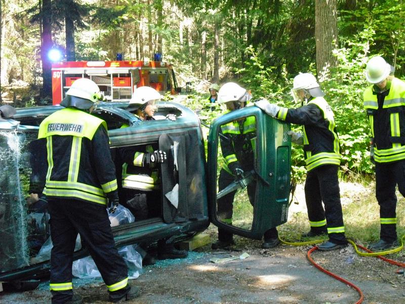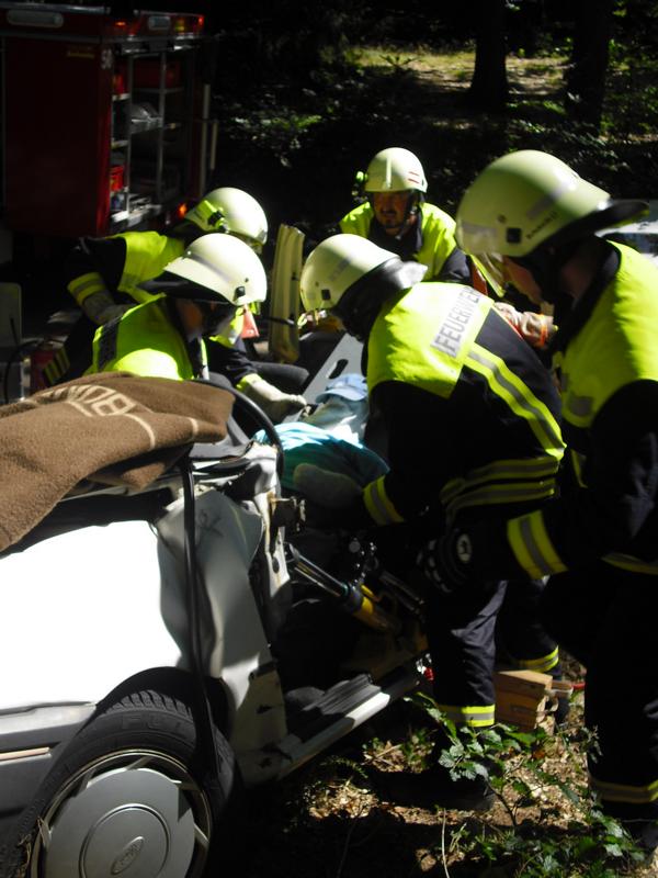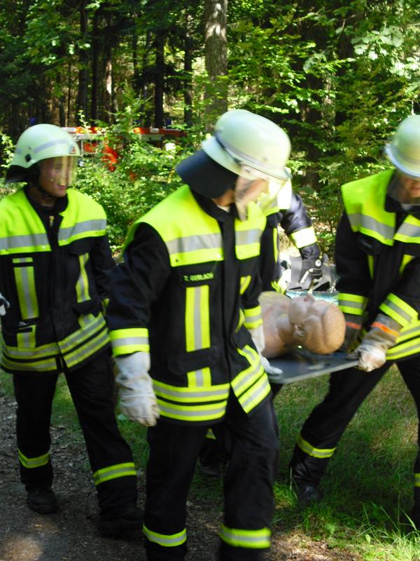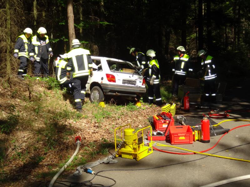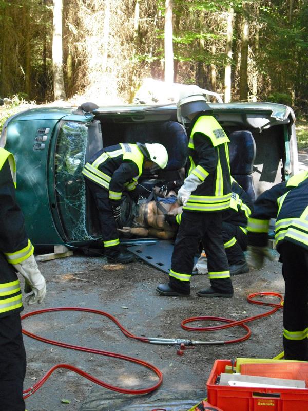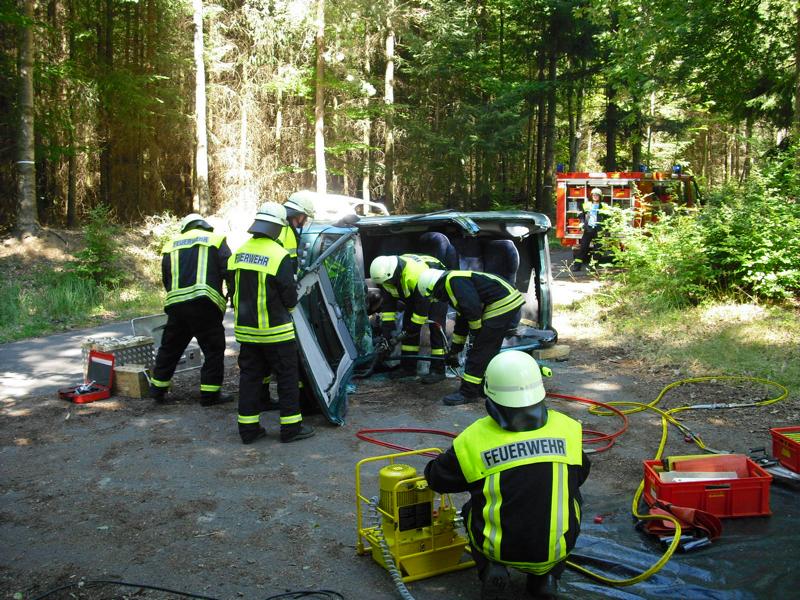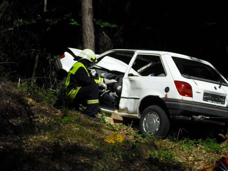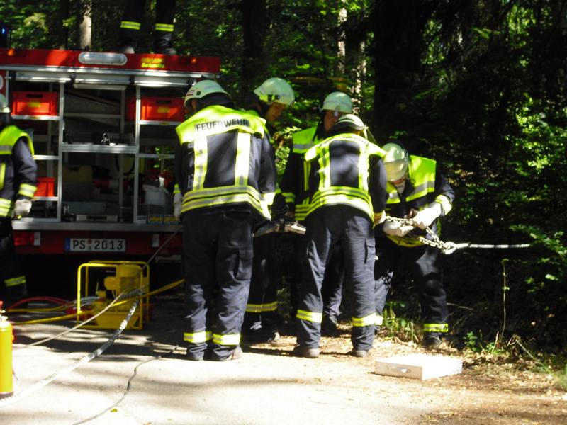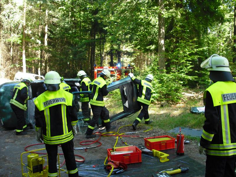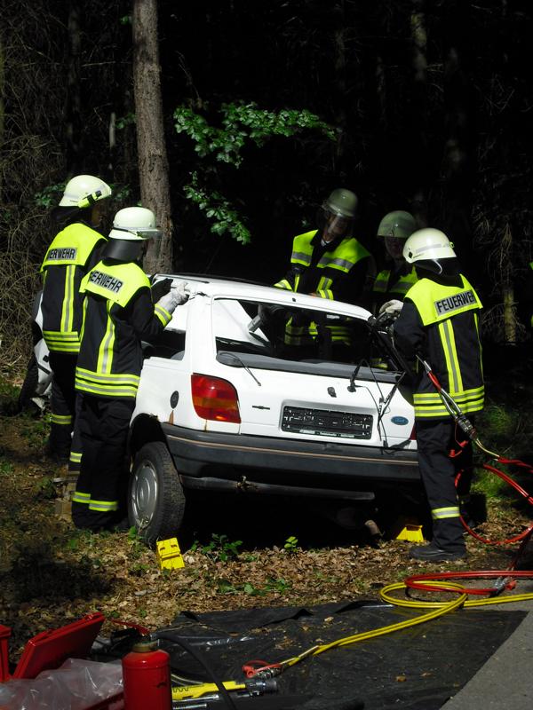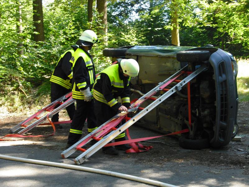 | Später kamen weitere drei Feuerwehrleute an die Unfallstelle nach. Die Fahrt ging Richtung Johanniskreuz an den Wertholzlagerplatz im ehemaligen Militärlager. Wir staunten nicht schlecht, als wir den nachgestellten Unfall sahen. Ein Auto lag auf der Seite und es befand sich eine nicht ansprechbare Person darin. Das zweite Auto fuhr frontal gegen einen Baum. Darin befand sich eine Person, die zwar ansprechbar war, aber das Fahrzeug nicht verlassen konnte, da sie eingeklemmt war. Zuerst wurde die Unfallstelle großräumig mit einer Vollsperrung abgesichert. Danach fingen wir an, am ersten Auto eine Crashrettung vorzunehmen. Dies bedeutet eine schnelle Rettung der verletzten Person aus ihrem Fahrzeug. Der Einsatzleiter Ulrich Wenger (Wehrführer) lies das Auto mit zwei Steckteilleitern gegen Umkippen sichern und gab dann den Befehl, das Dach des Fahrzeuges zu entfernen. Dies ging alles sehr rasch und so konnte man schon nach wenigen Minuten an die verletzte Person herankommen. Mit einem Rettungsbrett wurde der Verletzte letztendlich befreit und an der Unfallstelle erstversorgt. Somit hatten wir die erste Peron gerettet und gingen zum zweiten Auto vor. Wir erkundeten auch hier zunächst die Lage und stellten fest, dass sich das Auto sehr nahe an einem Baum befand. Ein Arbeiten mit dem hydraulischen Rettungszylinder wäre in dieser Situation nicht möglich gewesen. Daher suchten wir uns ein Anschlagmittel, in unserem Fall ein Buchenbaum, und zogen das Fahrzeug mit Hilfe eines Drahtseils und dem Spreizer vom Baum weg. Als wir dies gemeistert hatten, begannen wir auch hier mit der Personenrettung. Zuerst sicherten wir wiederum das Auto und begannen dann mit dem hydraulischen Rettungssatz (Schere, Spreizer und Rettungszylinder), die verletzte Person zu retten. Auch in diesem Fall nahmen wir das Dach vom Fahrzeug ab, um besser an die Person zu kommen. Nach kurzer Zeit konnten wir auch die zweite Person befreien und sie, wie auch die erste Person, an den Rettungsdienst übergeben. Diese Einsatzübung war für die Freiwillige Feuerwehr ein voller Erfolg und wir konnten uns mal wieder beweisen, dass wir für den Ernstfall gerüstet sind. Ein ganz besonderer Dank geht an Benjamin Helfrich und Christian Lahner, die diese Einsatzübung verwirklicht haben. Für solch eine Übung braucht man mehrere Geräte wie z. B. einen Radlader und Anhänger, um die Autos so zu justieren. Ein großes Dankeschön geht auch an die Firma Klaus Stümper (Schrott- und Autoverwertung) aus Pirmasens für die Bereitstellung der Fahrzeuge. Wenn wir solche Möglichkeiten nicht hätten, könnten wir uns für den Ernstfall nicht so gut vorbereiten. Wir haben auch zusätzlich die Sonderübung per Videokamera aufgenommen, um sie in den nächsten Übungen zu analysieren. Auch hier ein Dankeschön an die Kamerafrau Michaela Lahner und die Fotografin Nathalie Ernst. |