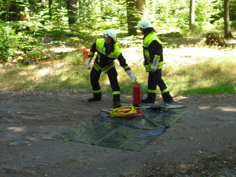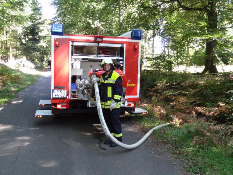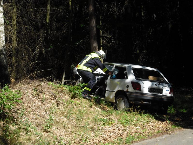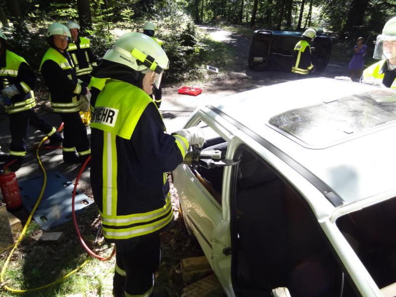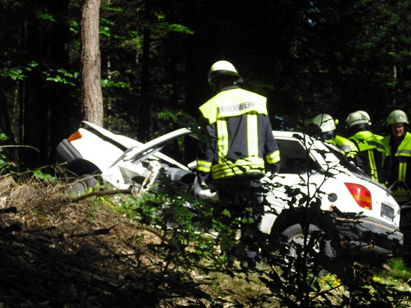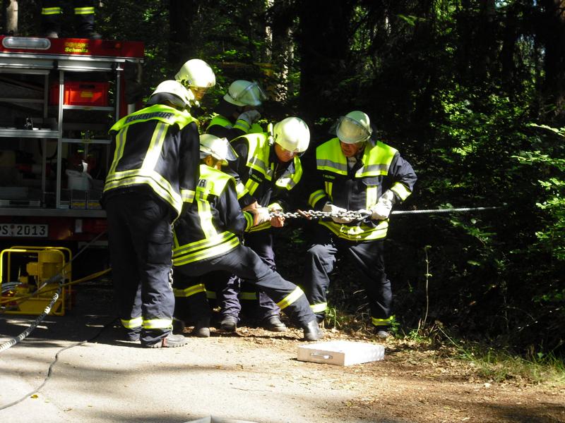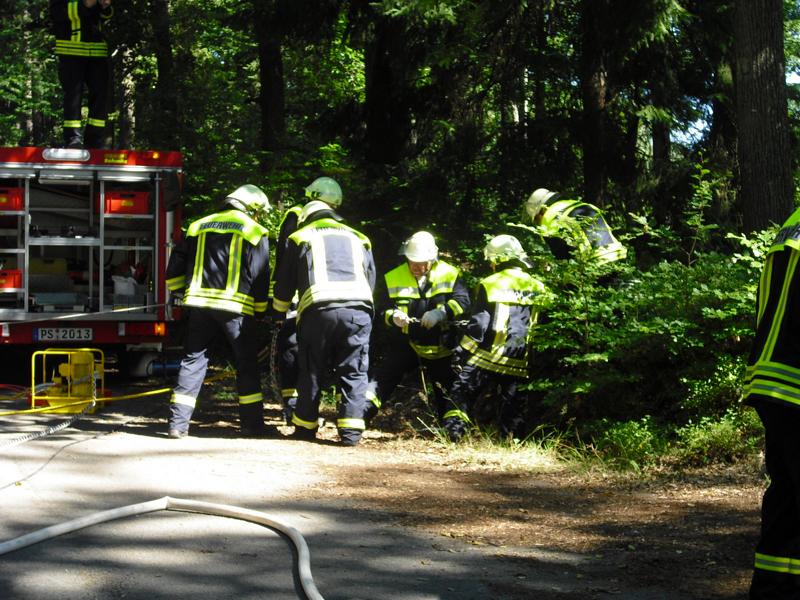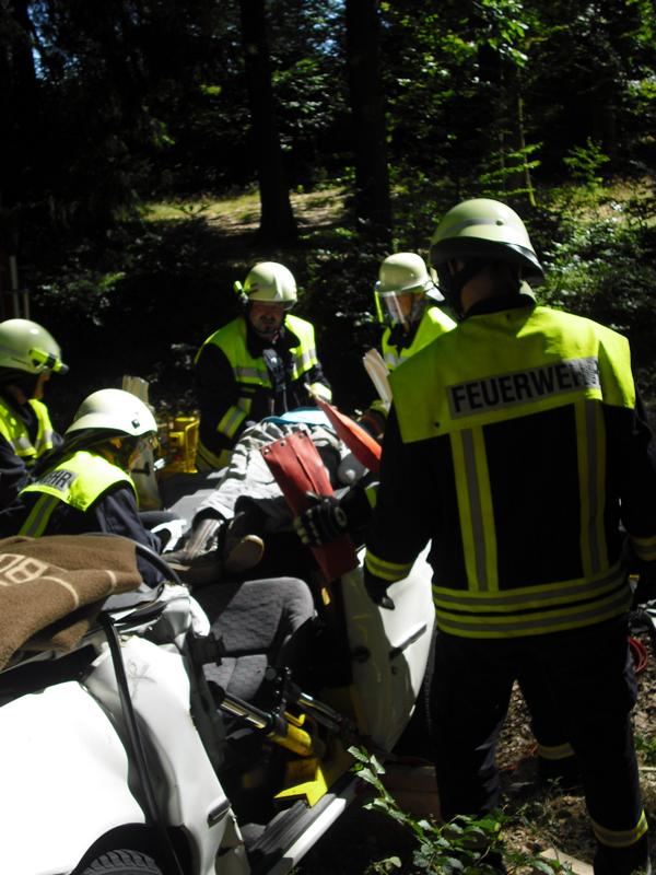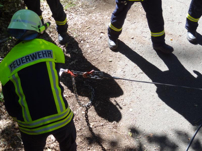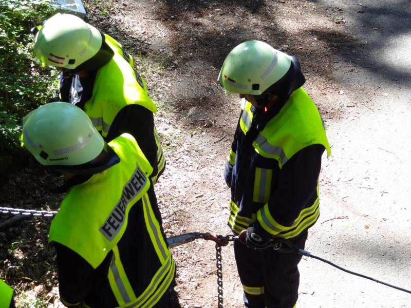 | Später kamen weitere drei Feuerwehrleute an die Unfallstelle nach. Die Fahrt ging Richtung Johanniskreuz an den Wertholzlagerplatz im ehemaligen Militärlager. Wir staunten nicht schlecht, als wir den nachgestellten Unfall sahen. Ein Auto lag auf der Seite und es befand sich eine nicht ansprechbare Person darin. Das zweite Auto fuhr frontal gegen einen Baum. Darin befand sich eine Person, die zwar ansprechbar war, aber das Fahrzeug nicht verlassen konnte, da sie eingeklemmt war. Zuerst wurde die Unfallstelle großräumig mit einer Vollsperrung abgesichert. Danach fingen wir an, am ersten Auto eine Crashrettung vorzunehmen. Dies bedeutet eine schnelle Rettung der verletzten Person aus ihrem Fahrzeug. Der Einsatzleiter Ulrich Wenger (Wehrführer) lies das Auto mit zwei Steckteilleitern gegen Umkippen sichern und gab dann den Befehl, das Dach des Fahrzeuges zu entfernen. Dies ging alles sehr rasch und so konnte man schon nach wenigen Minuten an die verletzte Person herankommen. Mit einem Rettungsbrett wurde der Verletzte letztendlich befreit und an der Unfallstelle erstversorgt. Somit hatten wir die erste Peron gerettet und gingen zum zweiten Auto vor. Wir erkundeten auch hier zunächst die Lage und stellten fest, dass sich das Auto sehr nahe an einem Baum befand. Ein Arbeiten mit dem hydraulischen Rettungszylinder wäre in dieser Situation nicht möglich gewesen. Daher suchten wir uns ein Anschlagmittel, in unserem Fall ein Buchenbaum, und zogen das Fahrzeug mit Hilfe eines Drahtseils und dem Spreizer vom Baum weg. Als wir dies gemeistert hatten, begannen wir auch hier mit der Personenrettung. Zuerst sicherten wir wiederum das Auto und begannen dann mit dem hydraulischen Rettungssatz (Schere, Spreizer und Rettungszylinder), die verletzte Person zu retten. Auch in diesem Fall nahmen wir das Dach vom Fahrzeug ab, um besser an die Person zu kommen. Nach kurzer Zeit konnten wir auch die zweite Person befreien und sie, wie auch die erste Person, an den Rettungsdienst übergeben. Diese Einsatzübung war für die Freiwillige Feuerwehr ein voller Erfolg und wir konnten uns mal wieder beweisen, dass wir für den Ernstfall gerüstet sind. Ein ganz besonderer Dank geht an Benjamin Helfrich und Christian Lahner, die diese Einsatzübung verwirklicht haben. Für solch eine Übung braucht man mehrere Geräte wie z. B. einen Radlader und Anhänger, um die Autos so zu justieren. Ein großes Dankeschön geht auch an die Firma Klaus Stümper (Schrott- und Autoverwertung) aus Pirmasens für die Bereitstellung der Fahrzeuge. Wenn wir solche Möglichkeiten nicht hätten, könnten wir uns für den Ernstfall nicht so gut vorbereiten. Wir haben auch zusätzlich die Sonderübung per Videokamera aufgenommen, um sie in den nächsten Übungen zu analysieren. Auch hier ein Dankeschön an die Kamerafrau Michaela Lahner und die Fotografin Nathalie Ernst. |