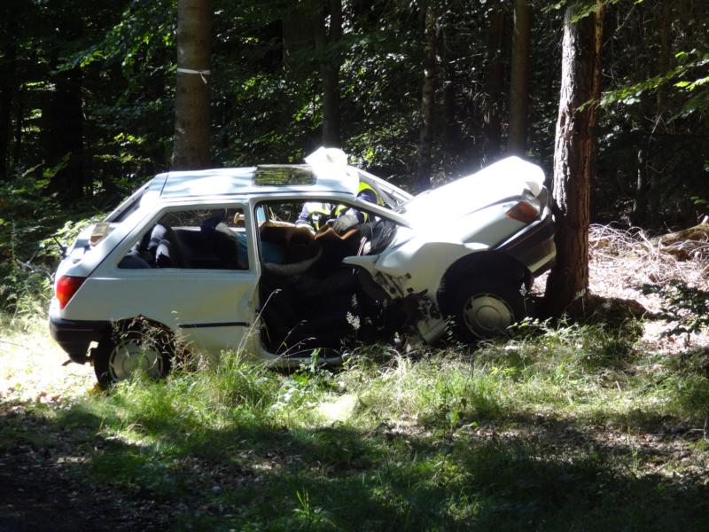 Unfallauto Nummer 2, das frontal an einen Baum fuhr und in dem eine ansprechbare Person war, die ihre Beine eingeklemmt hatte.
