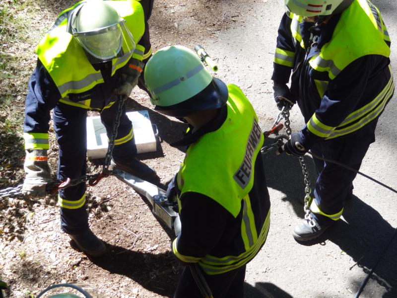 Patrick Wetzke beim Bedienen des Rettungszylinders. Dahinter der stellvertretende Wehrführer Christian Lahner.
