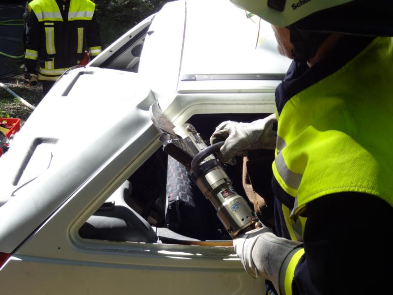 Ralf Meinert mit der Rettungsschere beim Durchtrennen des Daches. Im Hintergrund ist Patrick Wetzke zu sehen.