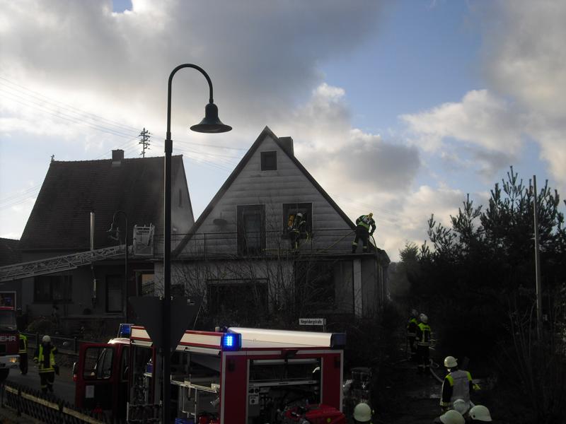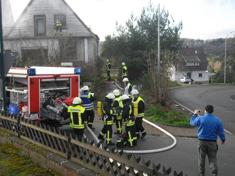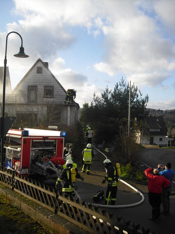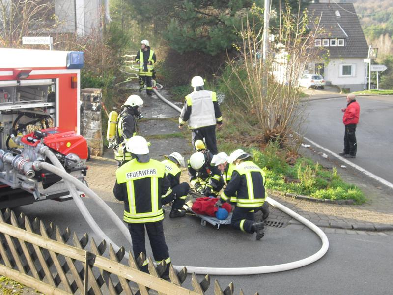 Der Maschinist und der Wassertrupp stellten die Wasserversorgung erst über das Tankfahrzeug und dann über den Hydranten sicher. Der erste Angriffstrupp rüstete sich mit dem ersten Strahlrohr aus und nahm die Brandbekämpfung im Obergeschoss vor. Zeitgleich ging ein zweiter Angriffstrupp mittels Wärmebildkamera ins Gebäude, um die vermisste Person (Dummy) zu suchen. Der Brandherd war relativ schnell gefunden und wurde abgelöscht, so dass man gemeinsam die vermisste Person in dem völlig verrauchten Haus suchen konnte. Nach dem Auffinden dieser, wurde die Person schnellst möglich ins Freie befördert. Der Angriffstrupp hatte dafür die Verstärkung des Sicherungstrupps angefordert. Gemeinsam wurde das Brandopfer möglichst schonend die Treppe hinunter getragen und den Rettungskräften außerhalb des Gebäudes übergeben. Kaum war die Rettungsaktion vollzogen, kam von dem noch im Haus befindlichen Angriffstrupp die Meldung „Mayday, Mayday, Mayday, defekt eines Atemschutzgerätes“. So wurde auch noch der zweite Sicherungstrupp mittels Rettungstasche dem Kameraden zur Hilfe ins Haus geschickt. Ihm wurde die Maske abgenommen und eine Rettungshaube angelegt. Mittels Bergetuch wurde er ebenfalls über die Treppe nach unten gebracht und übergeben. Um den unter Atemschutz vorgehenden Trupps die Arbeit im Inneren des Gebäudes zu erleichtern, wurde die Belüftung des Gebäudes mittels eines Lüfters eingeleitet.