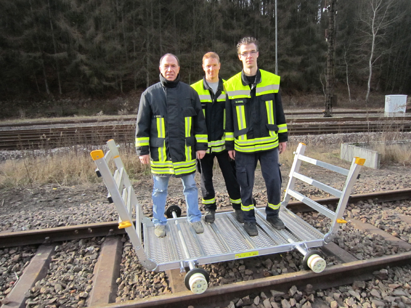 Der Feuerwehr Münchweiler steht ab sofort ein Schienenretter für Einsätze im Gleisbereich der Deutschen Bahn AG zur Verfügung. Der Rollwagen kann an einer gut zugänglichen Stelle auf der Schiene eingegleist und zur Einsatzstelle geschoben.
