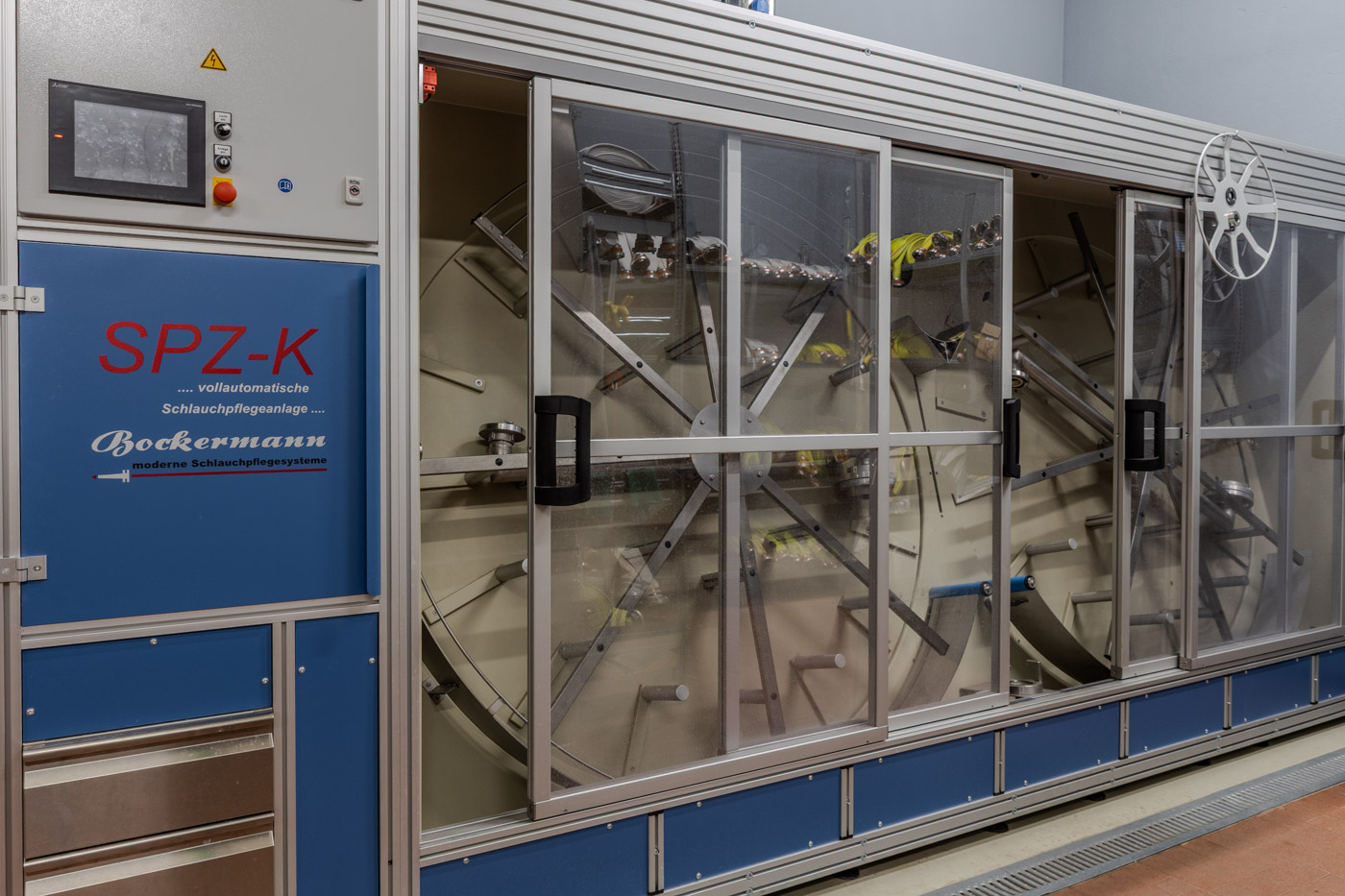 Unsere moderne Schlauchwaschanlage vom Typ SPZ-K der Firma Bockermann gewährleistet eine schnelle, gründliche und materialschonende Reinigung der im Einsatz verwendeten Feuerwehrschläuche.